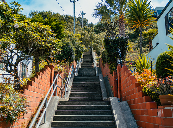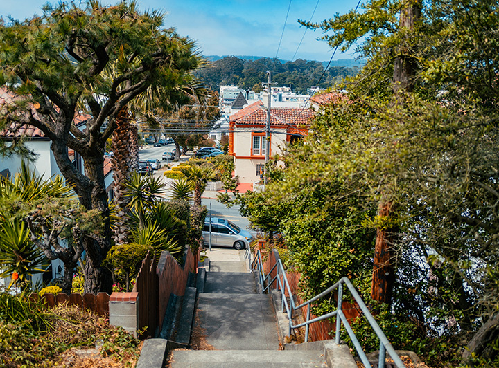 The stairways can be accessed from 15th and Kirkham upward, or on Lawton between 15th and Lomita, going down!