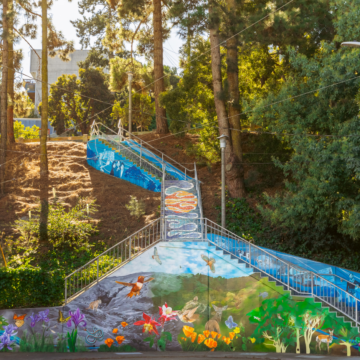 Burnside Mural+ is a resident-led initiative to create a visual representation of the colorful history of Glen Park that includes both a large mural and a tiled stairway.