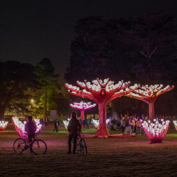 Entwined’s forest of illuminated color has lit up Peacock Meadow in Golden Gate Park every winter since 2020, immersing park visitors in a realm of art, technology, and nature. As of 2022, the installation features twice a week performances and other engaging art activations.