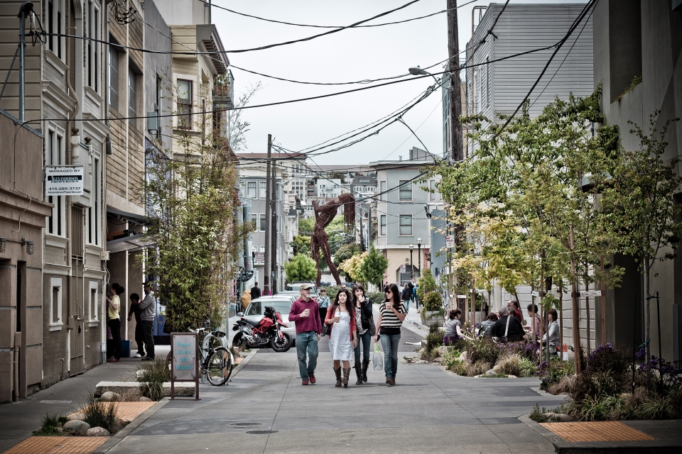 Linden Alley is one of San Francisco’s foremost “living alleys.” Once an unremarkable side street in Hayes Valley, the alley has been transformed into a pedestrian-oriented destination featuring seating, beautiful landscaping, and local businesses. Linden Alley has been hailed as a successful model for shared public spaces in the Bay Area and beyond.