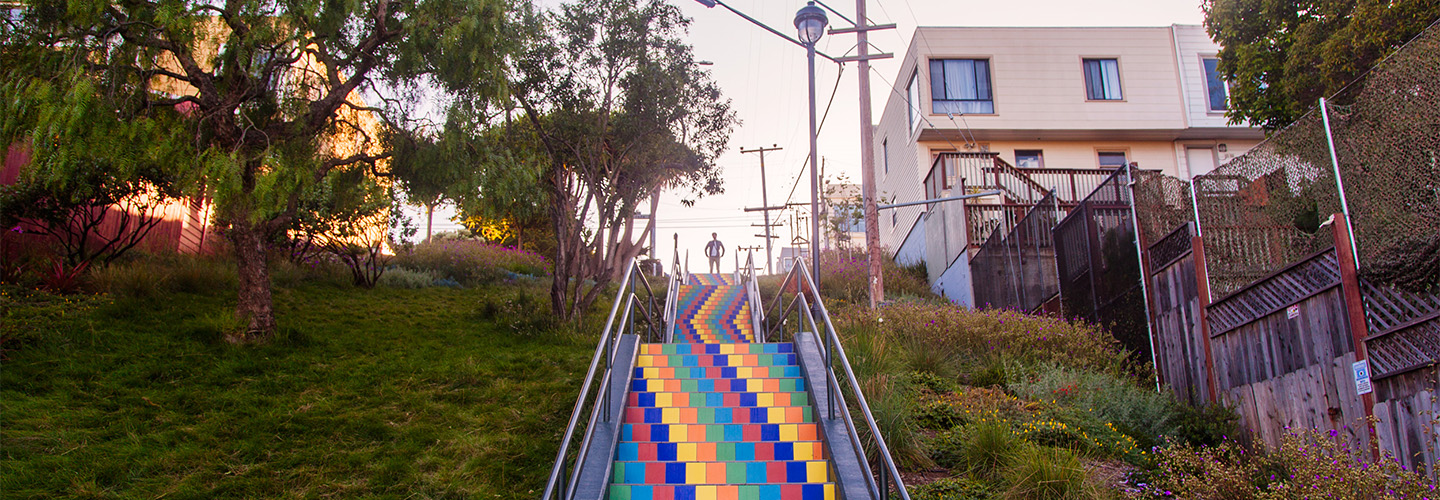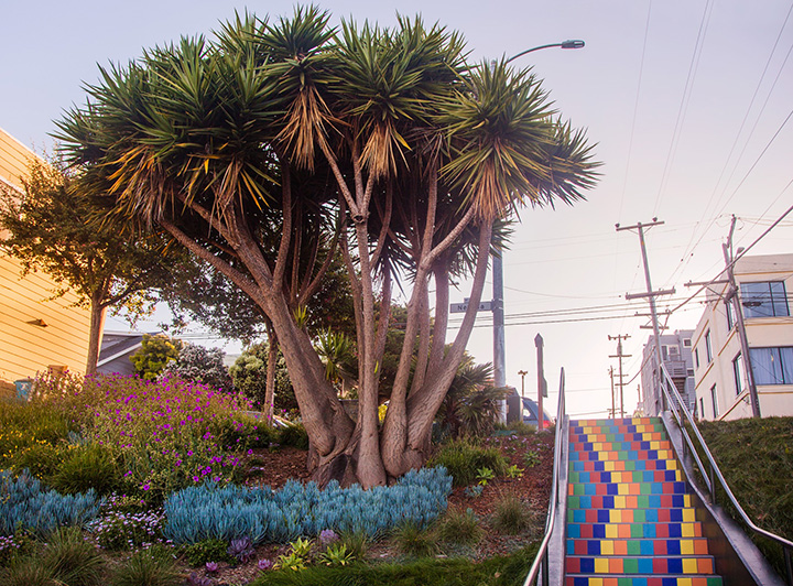 Once a trash-covered hillside, San Francisco’s Tompkins Stairway Garden is now a safe and welcoming street park, featuring a drought-tolerant garden in year-round bloom and a colorful tiled stairway.