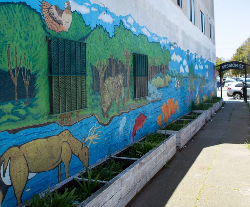 We started the first mural in June of 2015. Phase 2 completed in December 2016 with mosaic stairs, landscaping, vertical planters, lighting and painting. Phase 3 included planter boxes, a new fence, more vertical gardens and our centerpiece, a new mosaic sign at the Mission Street entrance of Kenny Alley in Spring 2018.