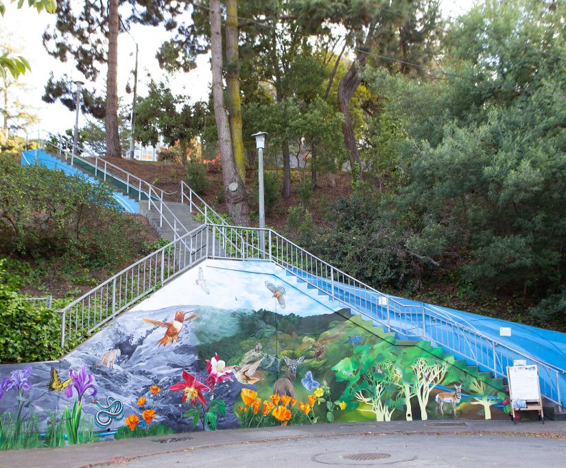 We gave that information to Twin Walls and did one intensive walk with a local historian. They ended up producing the most gorgeous design - beyond our imagination. At the top of the mural are the Gum Tree Girls, and along the sides are iconic images from Glen Park history, from Mission Zoo to its very beginnings with the Yelamu.