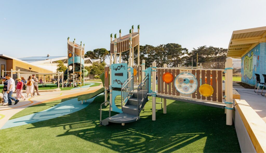 Herz Playground in San Francisco’s Visitacion Valley is the tenth playground we’ve renovated as part of our Let’sPlaySF! initiative in collaboration with the SF Recreation & Park Department. The new park includes two play areas, new paths, benches, picnic tables, a drinking fountain, and more! Up next for Let’sPlaySF! are Richmond and Buchanan Street Mall playgrounds.