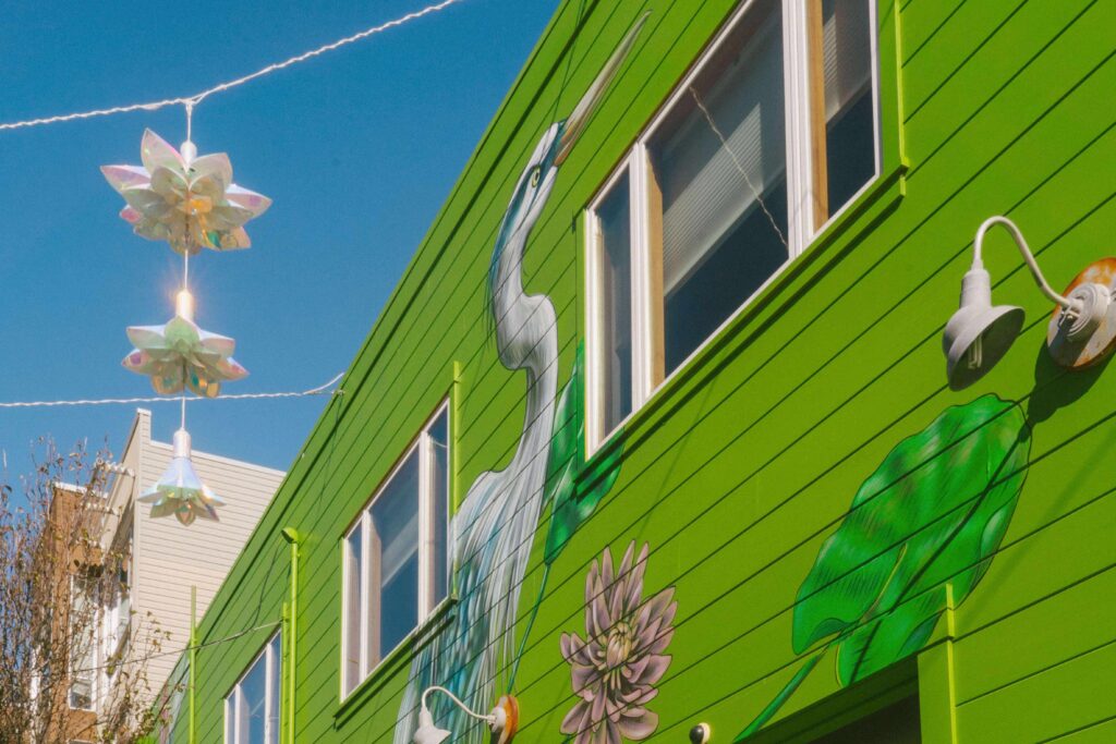 Over the last three years, we’ve worked closely with Moss Street neighbors to install two murals, string lighting, rain cisterns, planters, and signage recognizing the space’s origins as a tidal wetland. This first phase of improvements was completed in January 2023, and there’s more to come in 2024.