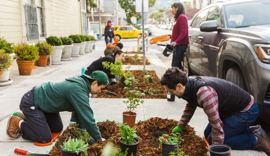 In partnership with Friends of the Urban Forest, SF Parks Alliance installed 30 sidewalk gardens along Page, Golden Gate, and Lyon Slow Streets to make them more beautiful, eco-friendly, and flood resistant. Neighbors along these streets applied to have these sidewalk gardens installed in their communities, joined community meetings to advise the plantings in their neighborhood, and assisted with planting.