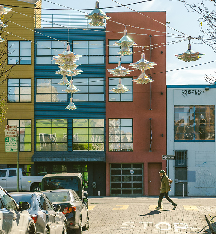 Introduce string lighting along buildings, trees and light poles to promote safety and beautify your block.